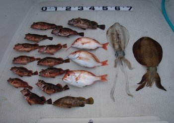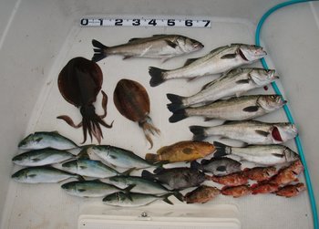 アコウ ・ アオハタ ・ ガシラ13匹 ・ メバル3匹 ・ アイナメ2匹 ・ カレイ4匹 ・ マイカ1パイ
